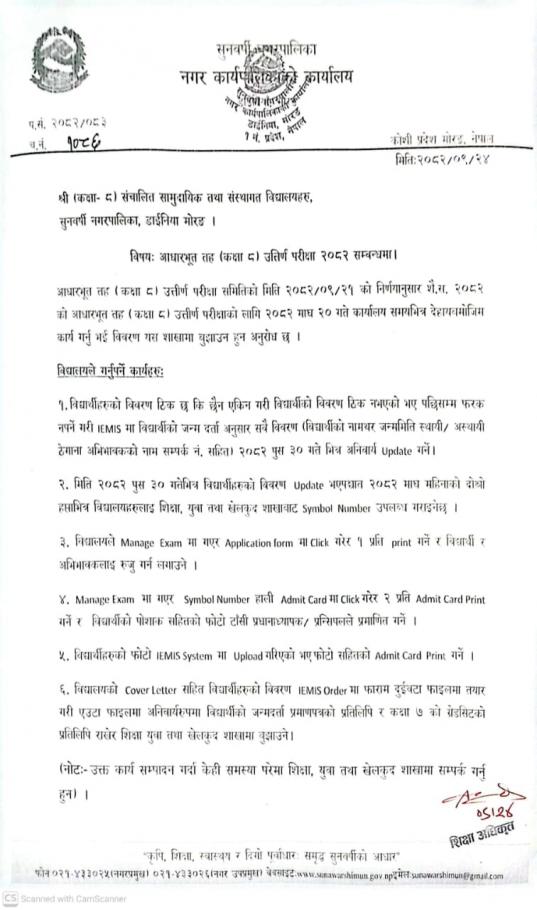 SUNMUN-33 आधारभूत तह (कक्षा ८) उत्तिर्ण परीक्षा २०८२ सम्बन्धमा।