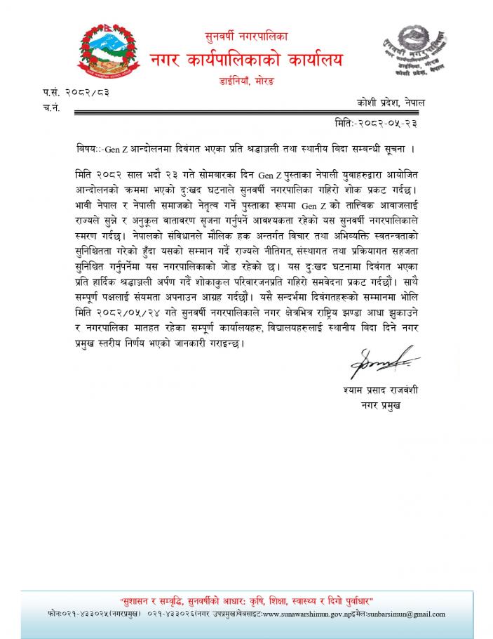 SUNMUN - 16 Gen Z आन्दोलनमा दिवंगत भएका प्रति श्रद्धाञ्जली तथा स्थानीय बिदा सम्बन्धी सूचना