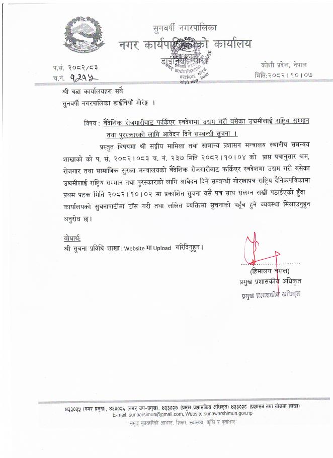 SUNMUN 38- वैदेशिक रोजगारीबाट फर्किएर स्वदेशमा उद्यम गरी बसेका उदयमीलाई राष्ट्रिय सम्मान तथा पुरस्कारको लागि आवेदन दिने सम्बन्धी सूचना