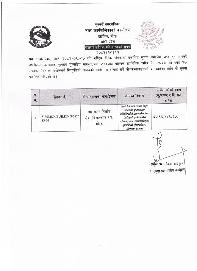 SUNMUN-42 बोलपत्र स्वीकृत गर्ने आशयको सूचना।