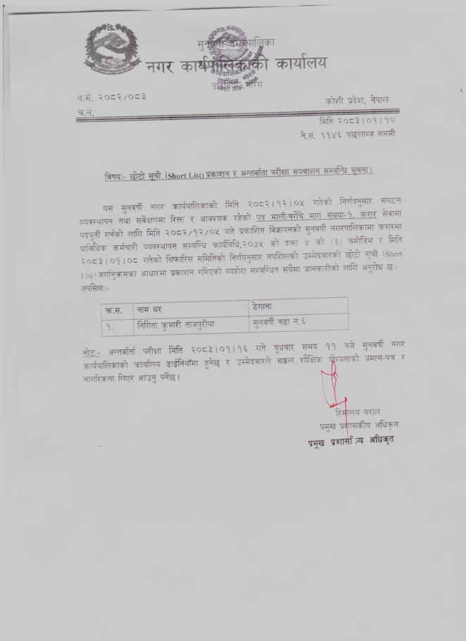 SUNMUN - 73 छोटो सूची (Short List) प्रकाशन र अन्तर्वाता परीक्षा सञ्चालन सम्बन्धि सूचना।