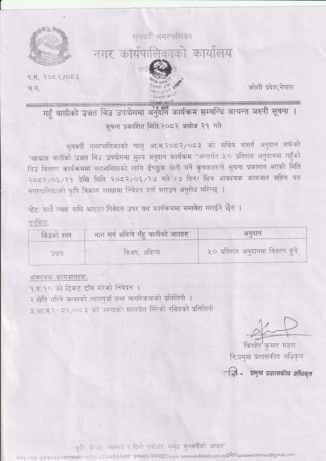 गहुँ बालीको उन्नत बिउ उपयोगमा अनुदान कार्यक्रम सम्बन्धि अत्यन्त जरुरी सूचना।